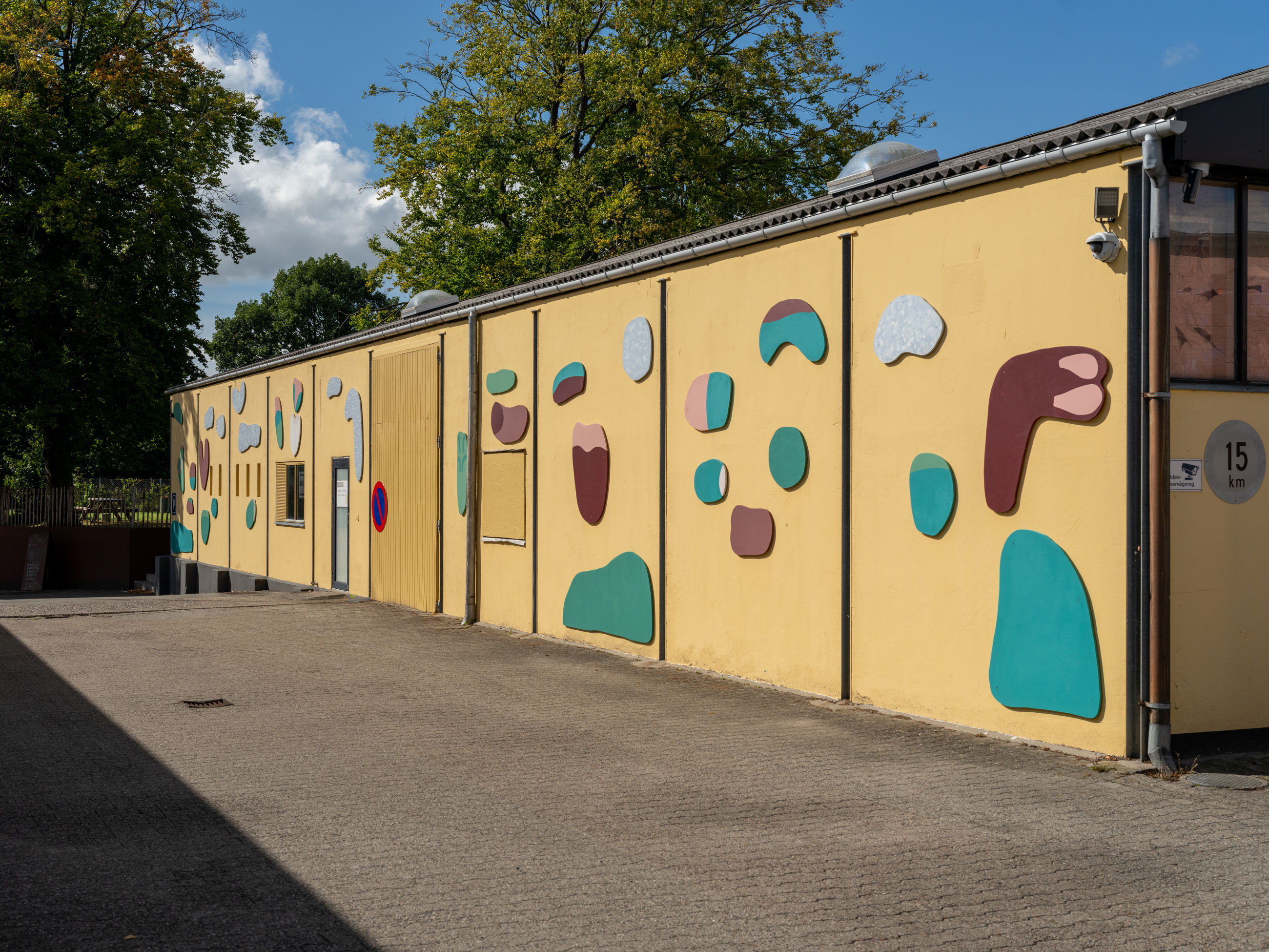 Selve gavlen er malet i en nedtonet grågul farve som passer til de mange gulstens bygninger i området. På de enkelte plader er anvendt en palet på tre farver; en klar grøn, en rødbrun og en meleret lyseblå.